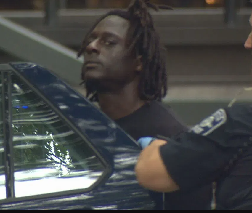 A photo showing Cordell Goosby being arrested in Belltown on June 13, 2023, following a shooting that killed a pregnant woman. [KOMO]