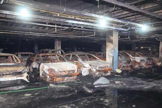 Cars left burnt in an underground parking lot in Incheon. A total of 140 cars were damaged in a fire caused by a Mercedes-Benz EV explosion on Thursday, and of them, 40 were completely burned. [YONHAP]