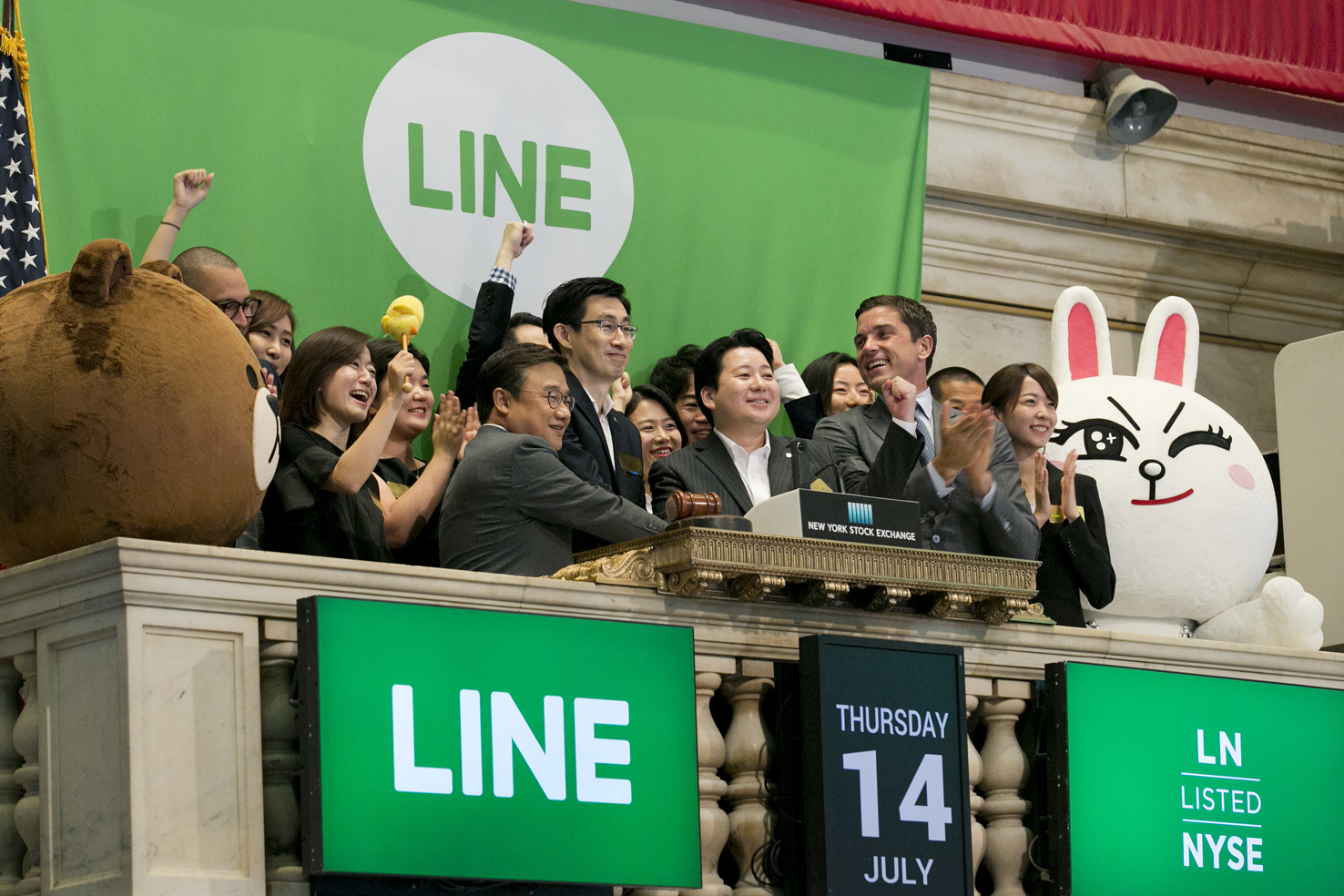 Executives with Japanese messaging app Line ring the opening bell for their company's IPO at the New York Stock Exchange, Thursday, July 14, 2016, in New York. Though little known in the U.S., Line has enjoyed a quick surge to popularity in Japan, filling an important communications hole after a devastating earthquake and tsunami in 2011 damaged phone infrastructure. In its home country, Line has more users than Facebook or Twitter. (AP Photo/Richard Drew)