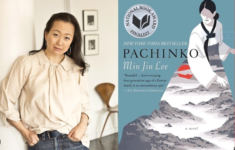 Min Jin Lee, left, alongside the cover of her novel ‘Pachinko’