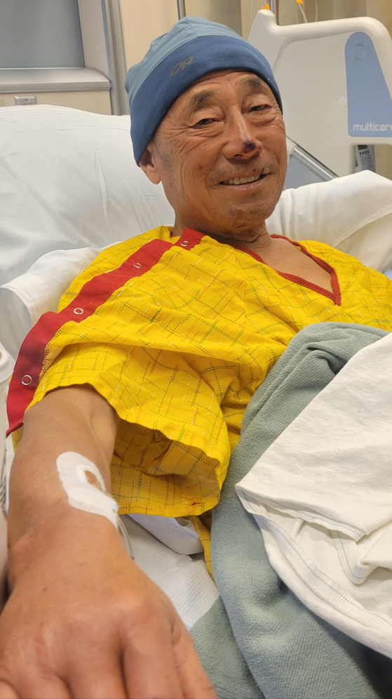 Jeong Jin-taek, who was rescued 58 hours after his disappearance, is smiling while receiving frostbite treatment at a hospital. [Provided by Cha Kyungseok]