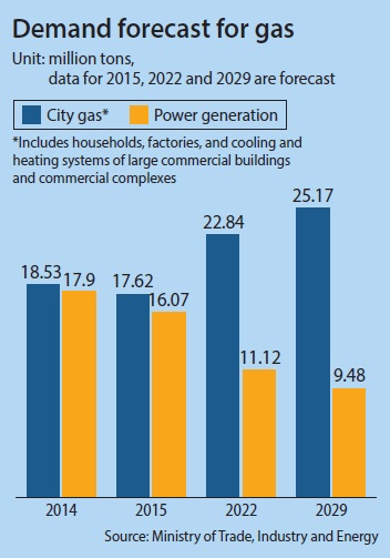 The use of LNG was forecast to shrink in coming years, particularly since two newly constructed nuclear power plants are slated to be completed around 2029. This will lead to an annual reduction of 4.17 percent through 2029, bringing annual consumption of LNG to 9.48 million tons. However, that projection came before the government announced its carbon emissions reduction goal in Paris earlier this month.