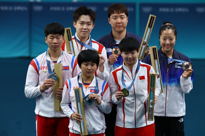 Paris 2024 Olympics – Table Tennis – Mixed Doubles Victory Ceremony – South Paris Arena 4, Paris, France – July 30, 2024. Gold medallists Chuqin Wang of China and Yingsha Sun of China with silver medallists Jong Sik Ri of North Korea and Kum Yong Kim of North Korea and bronze medallists Jonghoon Lim of South Korea and Yubin Shin of South Korea pose on the podium with their medals after winning. [REUTERS]