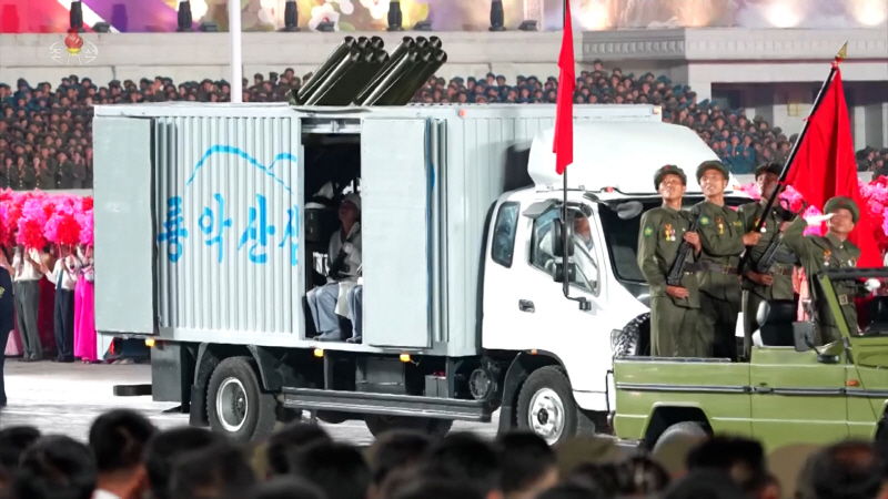North Korea’s Korean Central Television (KCTV) aired a recorded broadcast on September 9, 2023, of the civil defense military parade held at Kim Il-sung Square in Pyongyang on the evening of the previous day to mark the 75th anniversary of the regime’s founding. Announcer Ri Chun-hee described the scene of trucks labeled “Ryongaksan Spring Water” marching in the parade as a “civil defense unit disguised as rocket artillery.” [KCNA]