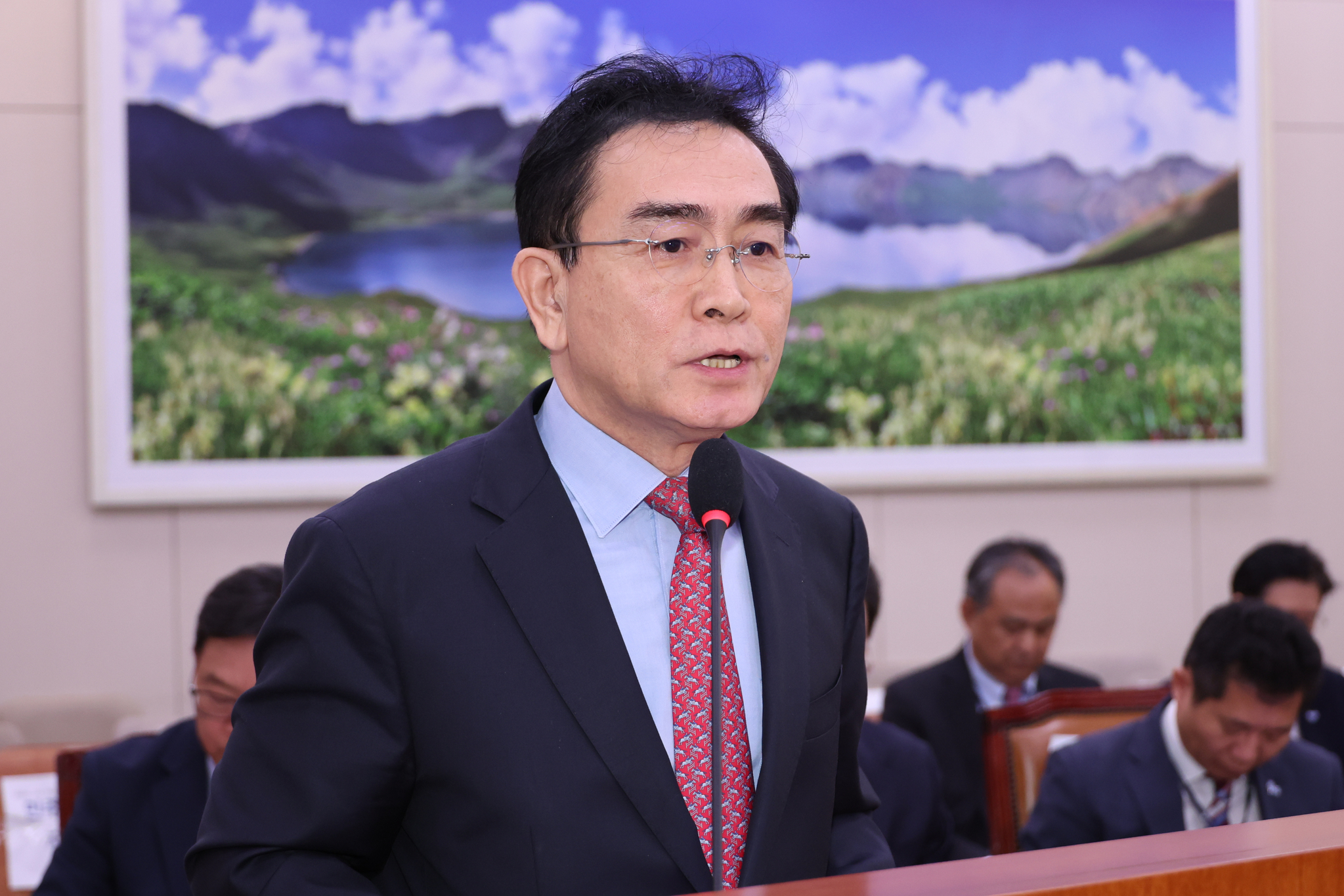 Tae Yong-ho, the secretary general of the Peaceful Unification Advisory Council, speaking during a parliamentary audit session at the National Assembly in Seoul on Oct. 8. [YONHAP]