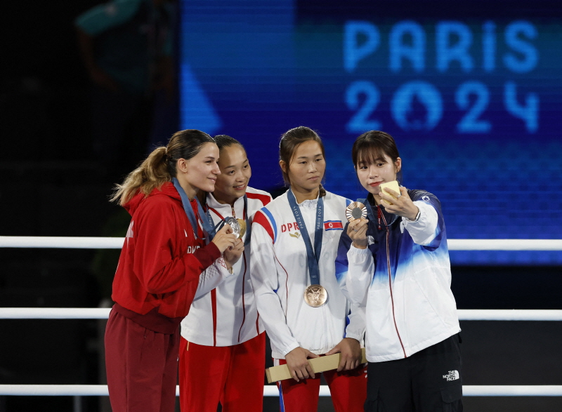 Paris 2024 Olympics – Boxing – Women’s 54kg – Victory Ceremony – Roland-Garros Stadium, Paris, France – August 08, 2024. Bronze medallist Im Ae-ji of South Korea takes a selfie photograph with bronze medallist Pang Chol-mi of North Korea, gold medallist Chang Yuan of China and silver medallist Hatice Akbas of Turkey. [REUTERS]