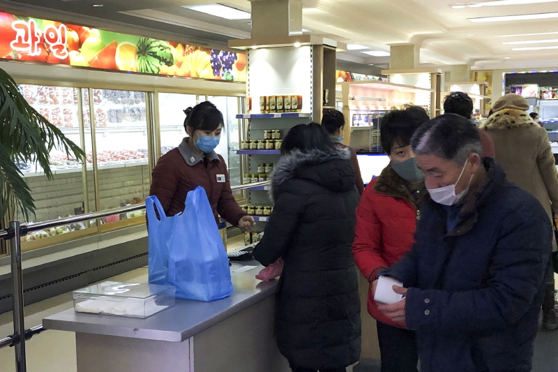 FILE – People in face masks seen in a supermarket at the Munsu-dong diplomatic compound amid an outbreak of the COVID-19 in 2019. [YONHAP]