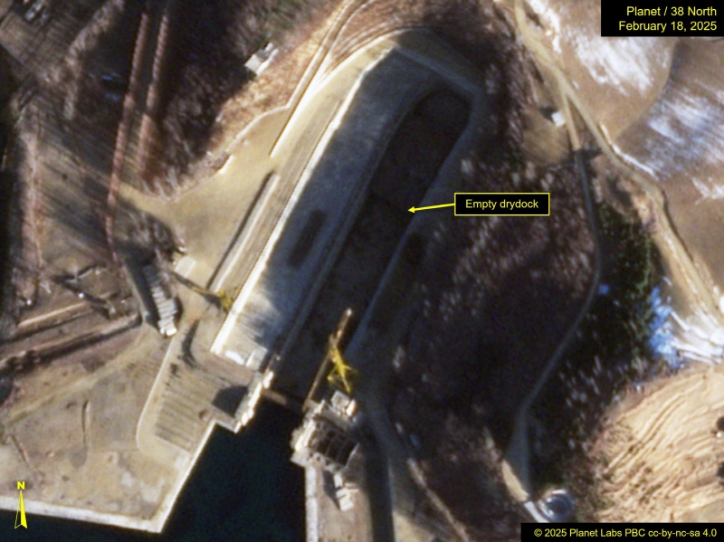 By the end of November, the submarine and its cover had been relocated to the southern end of the dry dock. However, satellite imagery indicates that as of February 11, the submarine has left the dry dock.