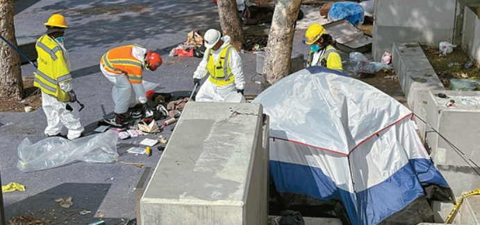 Behind the buses, workers from the LA Sanitation Bureau busily broke down the camps and removed garbage. The furniture used to make a living weighs a lot. Soon, two nine-ton trucks were full.