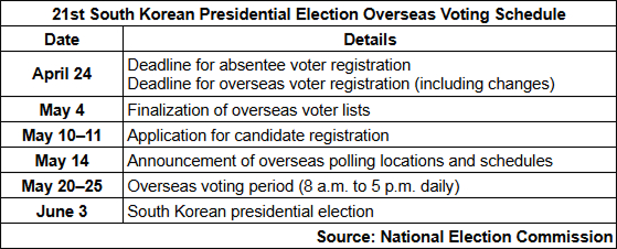 The overseas voter list will be finalized by May 4. In Korea, registration for presidential candidates by each political party is scheduled to be completed from May 10 to May 11. On May 14, the overseas election commissions will announce the locations and operating periods of up to four overseas polling stations per diplomatic mission. Voting hours will generally be from 8 a.m. to 5 p.m., although times may vary by location.