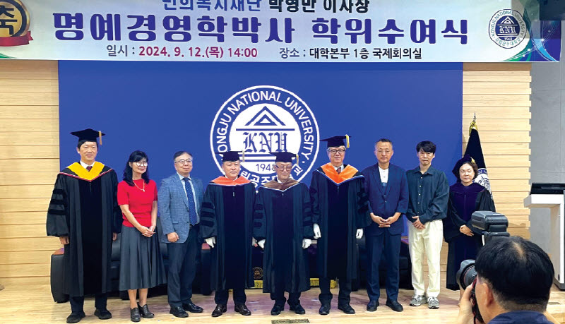 On September 12, Park Hyung-man (87), chairman of the Manhee Koju Foundation, was awarded an honorary Doctor of Business Administration from Gongju National University. The ceremony was attended by various dignitaries from the city of Gongju and South Chungcheong Province, who applauded Park’s recognition.