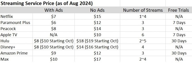 Ad-free subscriptions ranged from $10 to $18 per month, with Apple TV Plus at $10 and Hulu at $18. Most of the services offered free trials, except for Netflix, Peacock, and Max. Of these, Hulu and Amazon Prime offered the longest free trial periods of 30 days.