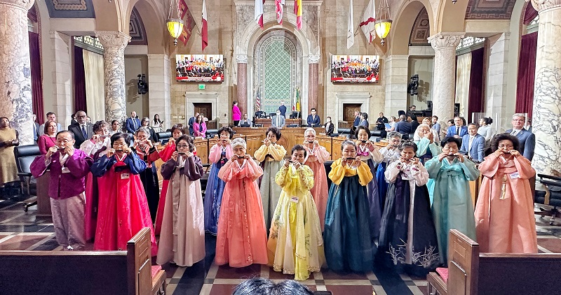 A group of Korean-American seniors, dressed in hanbok (traditional Korean attire), perform the U.S. national anthem on harmonicas at the L.A. City Council on June 7. These talented individuals are students of the harmonica class at the Korea Town Senior and Community Center. After being invited by the council, they diligently practiced for several months, and their remarkable performance garnered a thunderous applause from the audience. [Sangjin Kim, The Korea Daily]