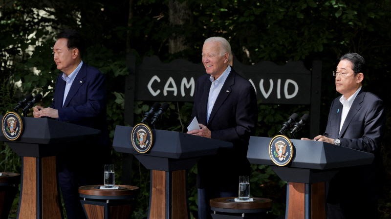 U.S. President Joe Biden holds a joint press conference with Japanese Prime Minister Fumio Kishida and South Korean President Yoon Suk Yeol during the trilateral summit at Camp David near Thurmont, Maryland, U.S., August 18, 2023. [Reuters]
