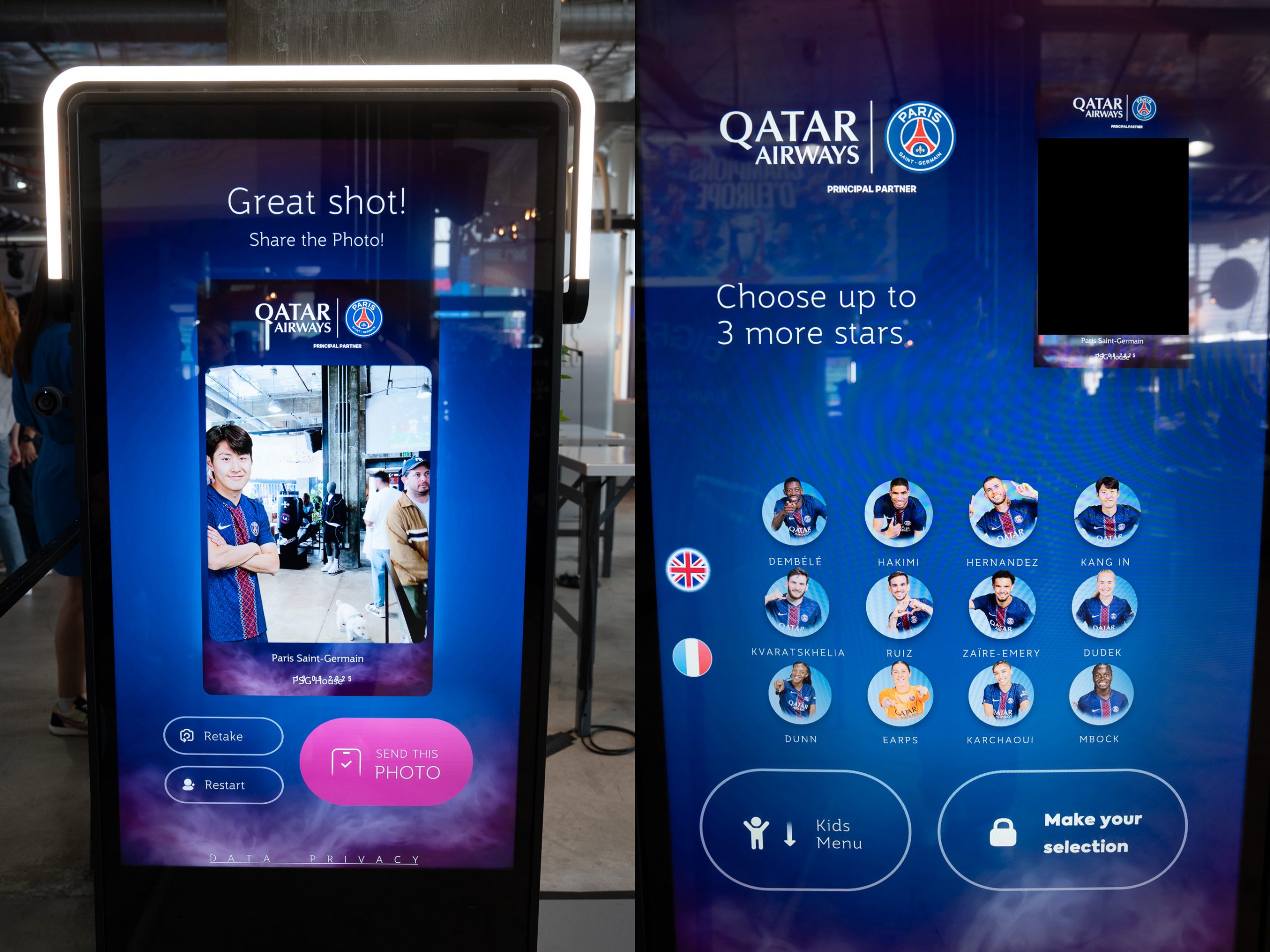AR photo booth at PSG House LA with Lee Kang-In example and player selection screen