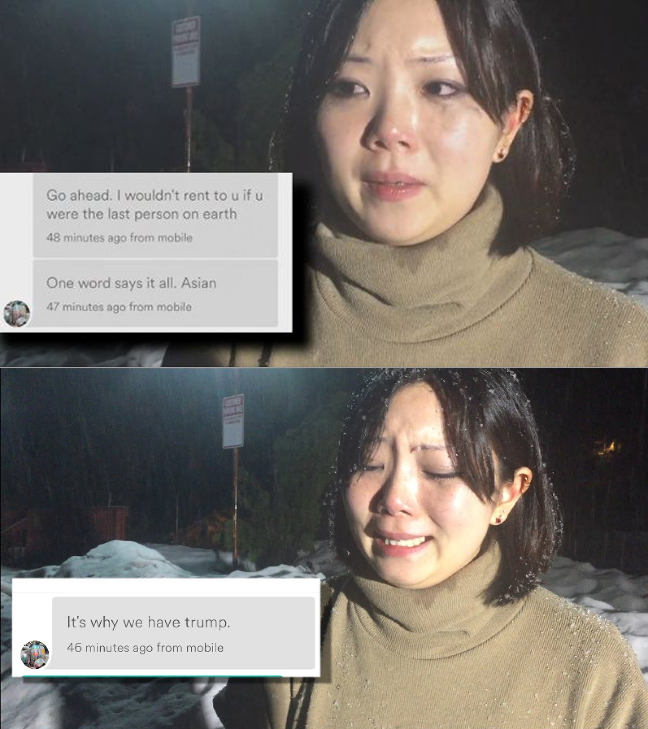 Suh had no choice but to turn back in the snowstorm. She met a KTLA reporter on the spot and talked about her incident, shedding tears. “I don’t understand the host’s actions. I came to the States when I was three years old, and this place has been my home ever since. There were sayings that racial discrimination is over after Obama was elected, but in reality it isn’t. It stings. It stings that after living in the U.S. for over 23 years, this is what happens.”
