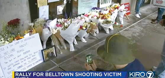 A rally for Eina Kwon, who was killed due to unprovoked shooting, is held in Belltown, Washington, on June 17. Mourners are leaving flowers and posters in front of the Kwon family’s restaurant. [KIRO7 capture]