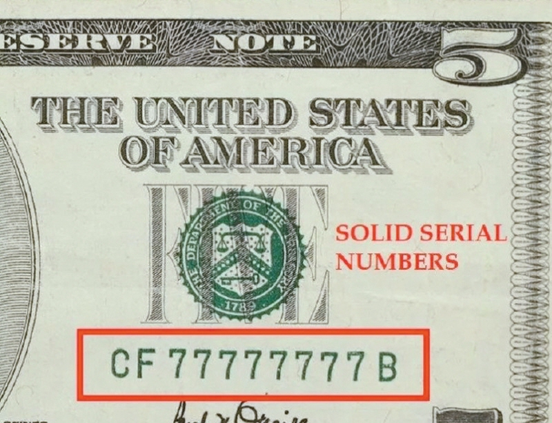 Some $5 bills with serials such as “G88888888A” or “B55555555C” could be worth thousands due to them carrying a “solid” serial number — meaning all digits in the serial are identical.