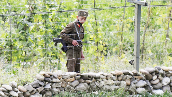 A North Korean soldier stands guard with his gun on the bank of the Yalu River in North Korea’s Ryanggang Province on Sept. 25, 2020. [YONHAP]