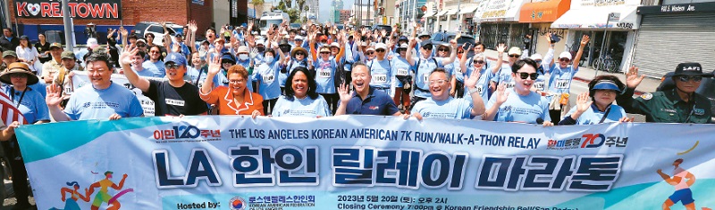 The Los Angeles Korean American 7k Run/Walk-A-Thon Relay, honoring the 120th anniversary of Korean immigration to the United States and the 70th anniversary of the U.S.-Korea Alliance, took place at 2 p.m. on May 20 near the Korean American Community Center in Koreatown, Los Angeles. Community leaders and participants cheer at the starting line before the running begins. From left to right: LA Mayor Karen Bass (fourth from the left), Councilwoman Heather Hutt, Councilman John Lee, Korean American Federation of Los Angeles President James An, and Korean American Democratic Committee President Steve Kang. [Sangjin Kim, The Korea Daily]