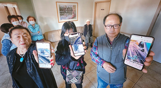 Victims of burglaries at Swansea Park Senior Apartments show photos of the incidents on their cell phones to a Korea Daily reporter. [Sangjin Kim, The Korea Daily]