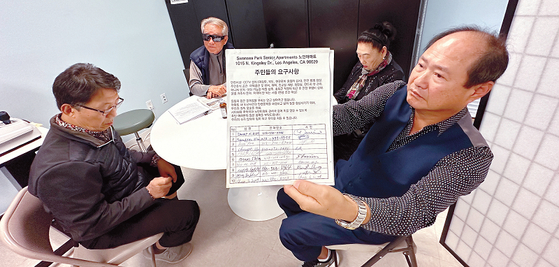 Residents of Swansea Park Senior Apartments discuss the petition signed by residents at the Wilshire Center-Koreatown Neighborhood Council on January 18. [Sangjin Kim, The Korea Daily]
