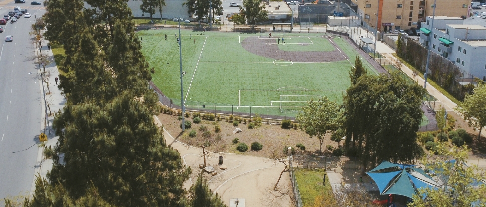 A drone captures Normandie Avenue and Seoul International Park in Koreatown on April 14. The field is covered with artificial turf. [Sangjin Kim, The Korea Daily]