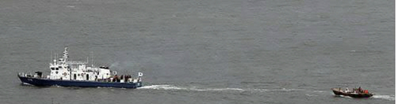 A Coast Guard vessel tows a small North Korean wooden boat that drifted south in the West Sea to be handed over to North Korea in February 2011. At the time, 31 North Koreans boarded a fishing boat and went south to the waters off Yeonpyeong Island. Four of them defected, and 27 returned to North Korea. [YONHAP]