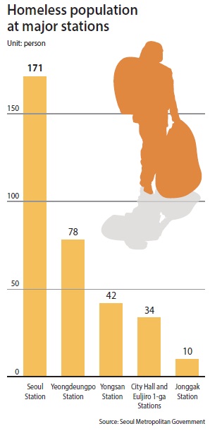According to the Seoul Metropolitan Government, 3,347 people stay at homeless shelters scattered around the city and 371 people live on the street. Of those living on the street, 171 live near Seoul Station.