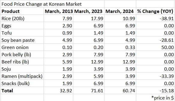 To track the rate of food inflation, the Korea Daily selected 10 food items, including rice, eggs, tofu, green onions, pork belly, beef ribs, soju, ramen, and snacks, which are favored by Koreans and compared their prices in 2013, 2023, and 2024.