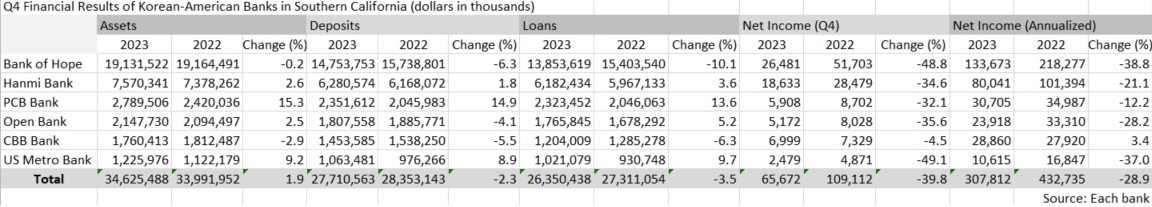 When analyzing the 2023 operating results of six Korean-American banks headquartered in Southern California – Bank of Hope, Hanmi Bank, PCB Bank, Open Bank, CBB Bank, and US Metro Bank – the total net income for the fourth quarter came to $65.67 million, while the total annualized net income was $307.8 million.
