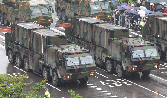 A Hyunmoo missile, a key asset of South Korea’s “three-axis” deterrence system, is showcased during a parade in central Seoul on Oct. 26, 2023, as part of the 75th Armed Forces Day celebrations. [KIM JONG-HO]