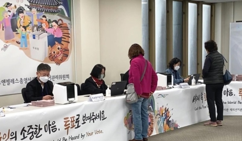 South Korean nationals cast their ballots at election booths set up by the Consul General of South Korea in Los Angeles in 2020. [Sangjin Kim, The Korea Daily]
