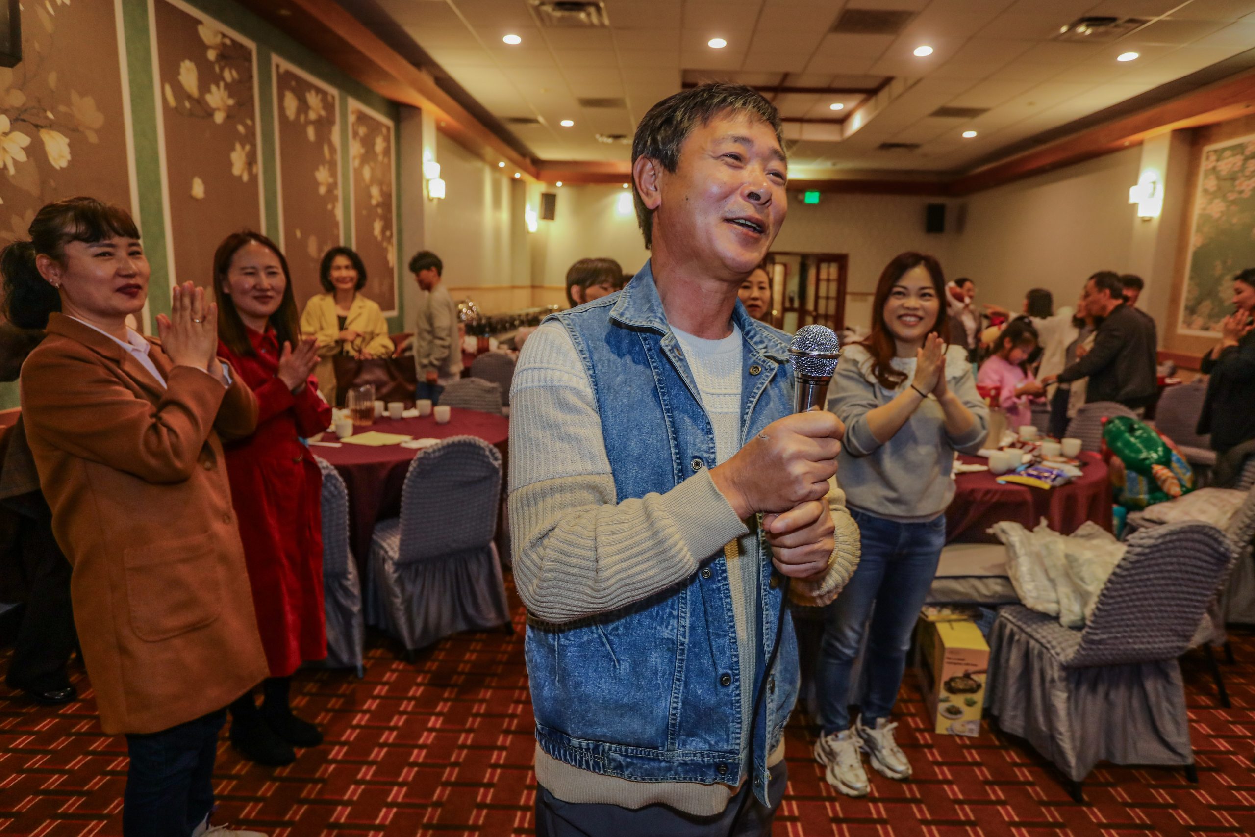 Choi, attending a year-end gathering of North Korean defectors in the U.S. in 2024, holds a microphone and sings. [Sangjin Kim, The Korea Daily]