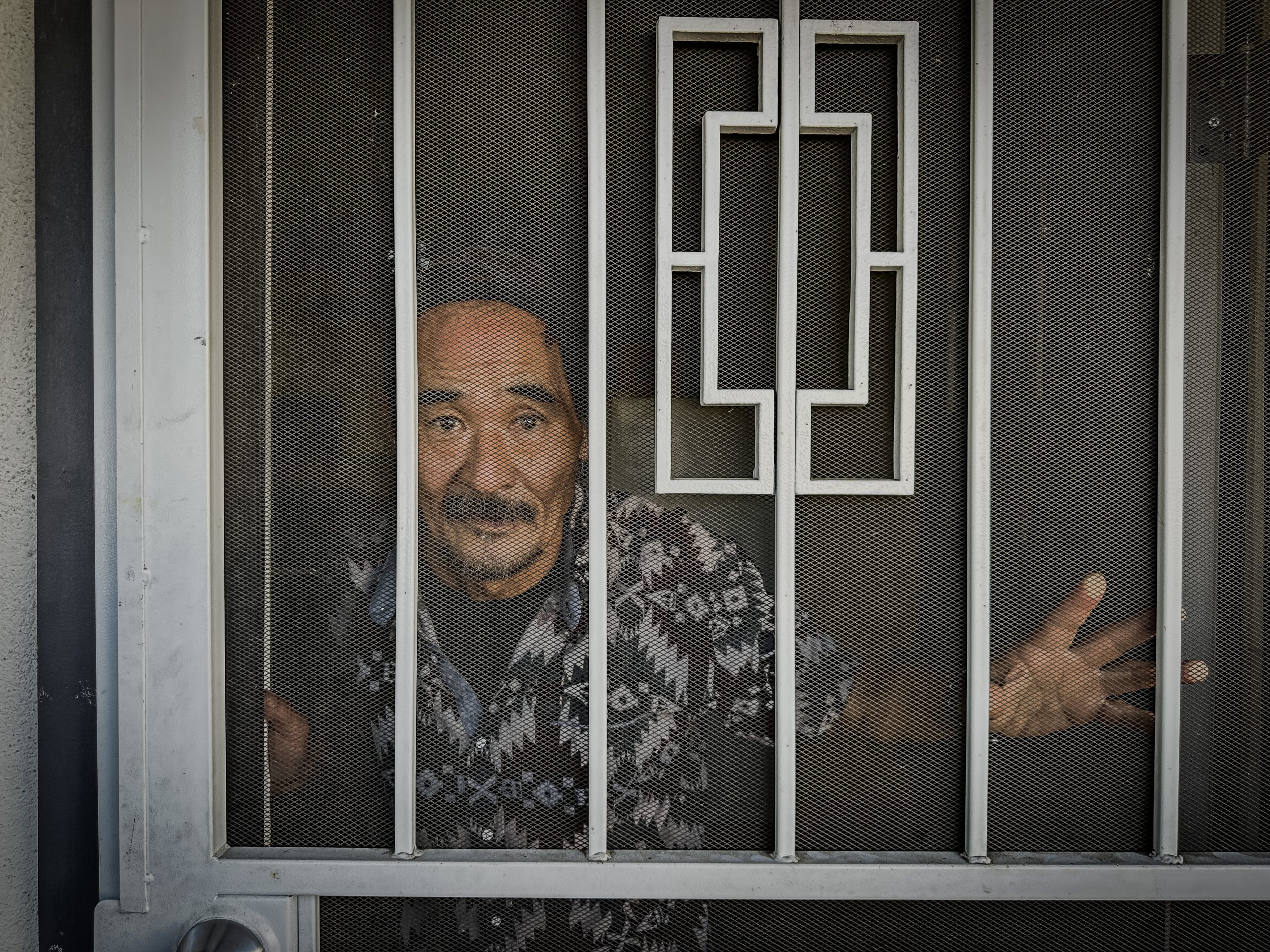 Jeon looks outside from inside the iron gate of the shelter where he lives. [Sangjin Kim, The Korea Daily]