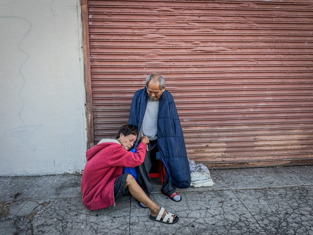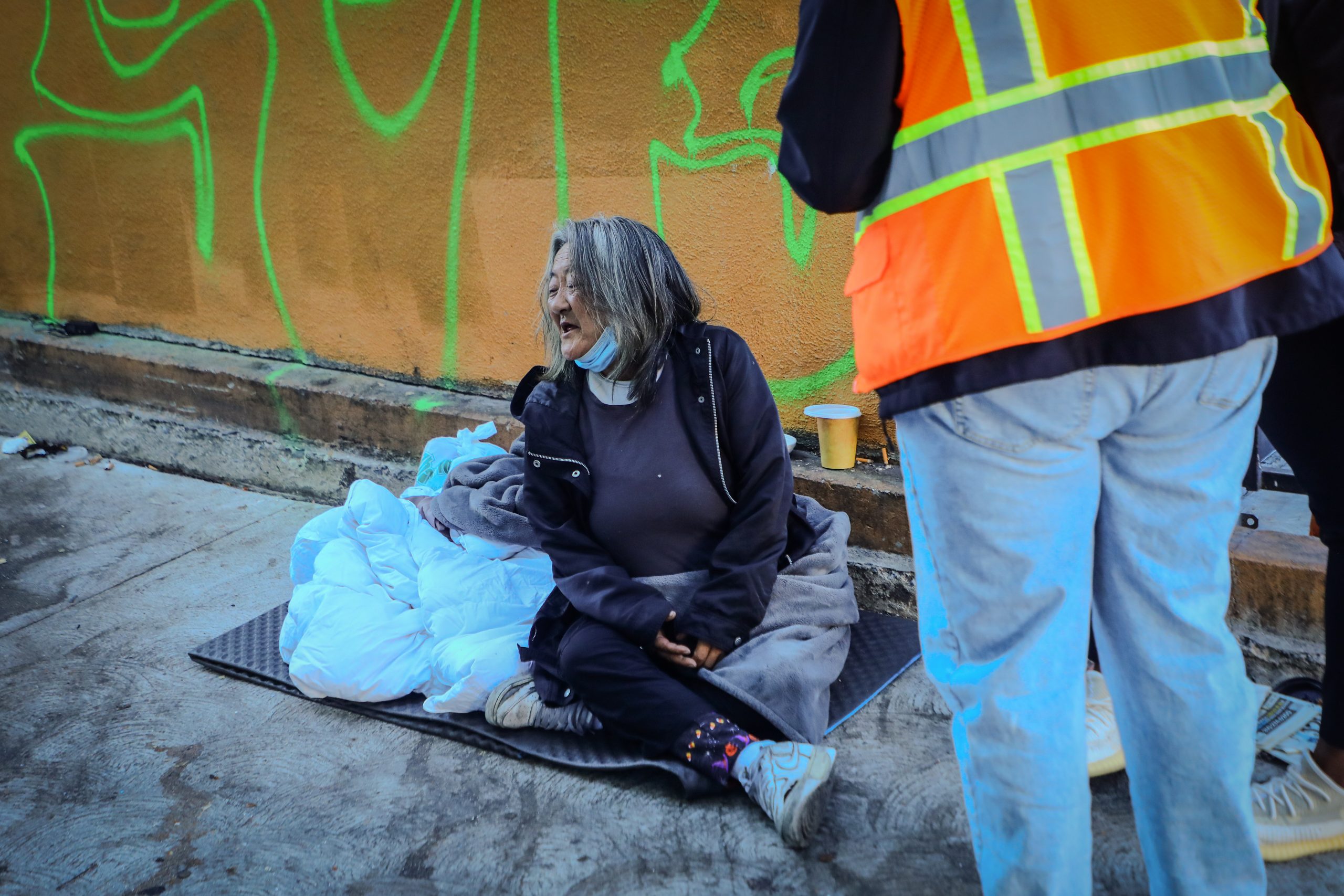 The cold from the concrete floor made an elderly man shiver. A few tattered blankets offered minimal warmth in a small tent on Washington Boulevard in Los Angeles’ Koreatown.