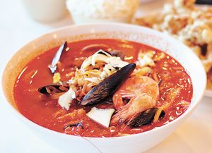 Traditionally, Jjampong broth was created by using onions and chili oil, to which cooks added a mix of vegetables and pork. This soup was aimed at feeding hungry students on a budget. The staple meal has evolved dramatically since then, to incorporate spicy soup broth, vegetables and fresh noodles, and an abundance of seafood like shrimp, mussels, and squid.