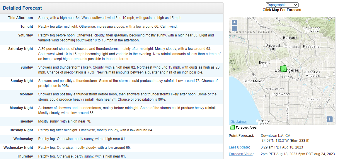 For instance, to receive updates about conditions in Koreatown, simply input the zip code 90005 to get the latest information. Here is the weather forecast as of 2 p.m. on August 18.