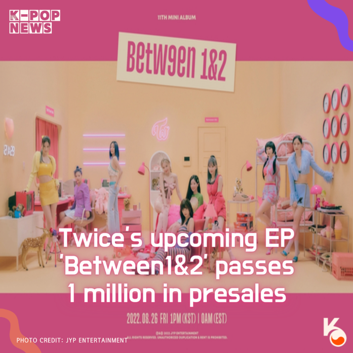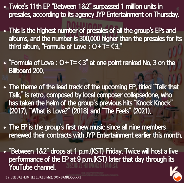 Twice’s upcoming EP ‘Between1&2’ passes 1 million in presales By Korea Daily Digital Aug 25, 2022 1:14 PM PDT #Twice #Between1and2 #JYPEntertainment #FolmulaofLove #Billboard200 #TalkthatTalk #KnockKnock #WhatisLove #TheFeels #kpop #kdrama #kmovie #korean #koreanamerican #love #kpopdance #kpopnews #katchup #katchupofficial #케이팝 #케치업 #케치업오피셜 Share FacebookXPinterestWhatsApp The Last Mile Before Delivery: HMGMA’s High-Stakes Quality Test Track Apr 28, 2026 4:16 PM PDT If Someone asks how many cars KIA sells…. Apr 28, 2026 3:32 PM PDT From U.S. Army Captain to Korean Public Service Worker Apr 28, 2026 3:25 PM PDT Tax Refunds Rise 11.3%, but Impact Feels Limited Apr 28, 2026 3:10 PM PDT Load more