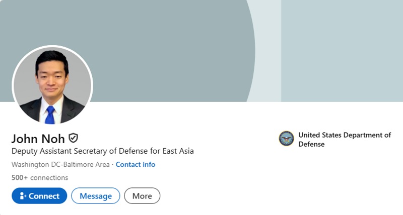 According to the Defense Department, John Noh was sworn in on January 20 as Deputy Assistant Secretary (DAS) of Defense for East Asia.