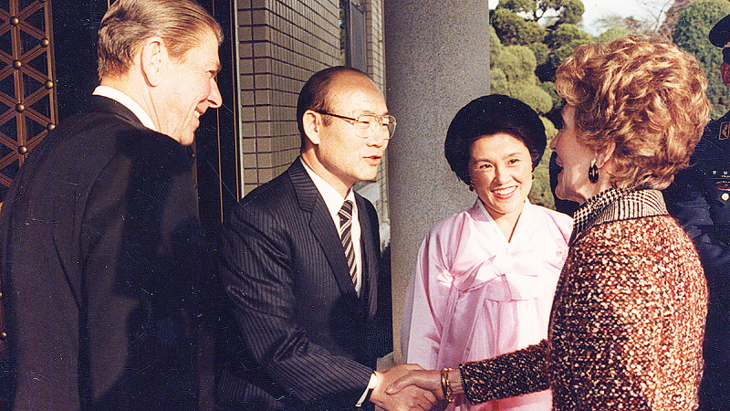 President Chun Doo-hwan and his wife greet President Ronald Reagan and the First Lady of the United States at the Blue House in 1980s. [JoongAng Photo]