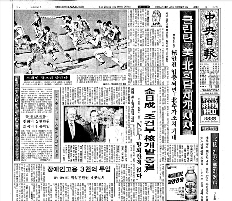 Front page of JoongAng Ilbo on June 17, 1994, covering the meeting between former U.S. President Jimmy Carter and North Korea’s founder Kim Il-sung in Pyongyang, North Korea. [JoonAng Photo]