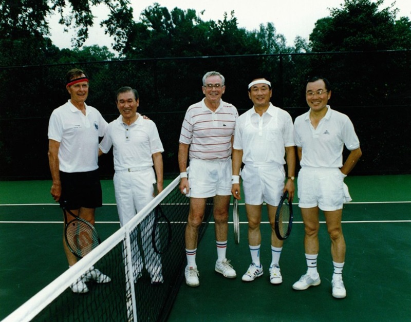 In July 1991, President Roh Tae-woo (second from left) visited the United States and, alongside U.S. President George H. W. Bush (far left), played a friendly tennis match against the team of Ambassador Donald Gregg (center) and Ambassador Hyun Hong-choo (far right) at the White House tennis court in Washington D.C., capturing a commemorative photo afterward. [KEI]