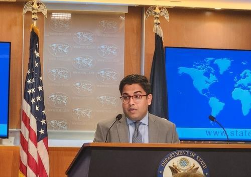 Vedant Patel, the State Department’s deputy spokesperson, speaks during a press briefing at the department in Washington on Oct. 22. [YONHAP]