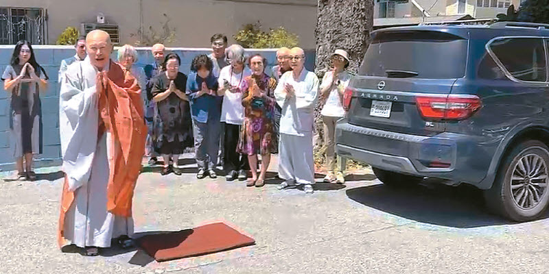 Venerable Jimyeong performs a ritual to pray for safety in front of the vehicle that will accompany him on the remaining journey before he sets off. The monk, with hands clasped together, also bids farewell to his supporters. [Prajna Gate Buddhist Temple]