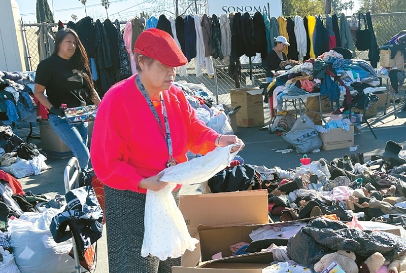 An Eaton wildfire victim looks through clothing donated by residents at a gas station parking lot in Altadena on Wednesday. [Sangjin Kim, The Korea Daily]