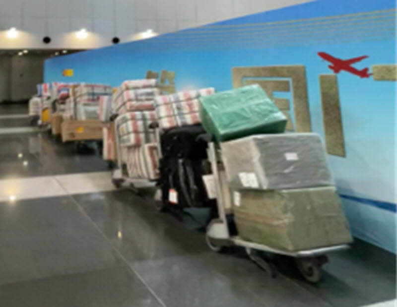 Baggage of North Korean workers at Beijing’s Capital International Airport, ready to board flights back to Pyongyang in mid-July [Photo provided by a source to the JoongAng Ilbo]