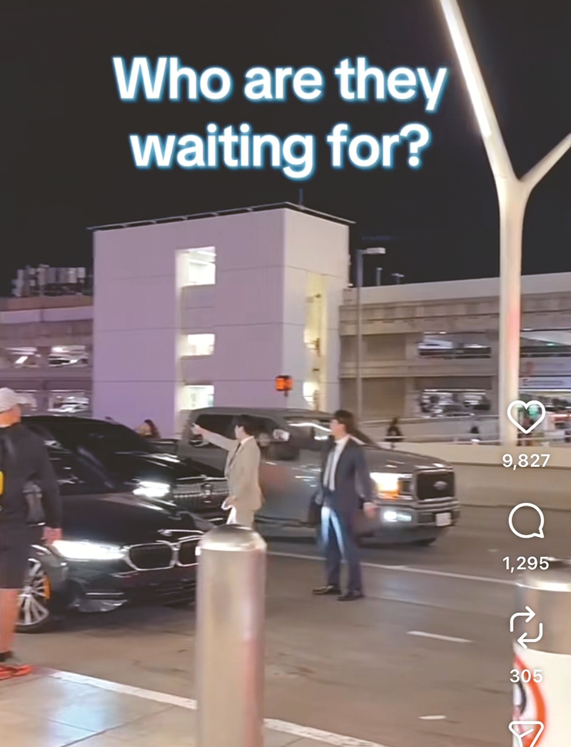 The footage shows several Asian men in dark suits positioning themselves at the international departures loading zone, preparing to receive someone. Using hand gestures, they blocked vehicles attempting to drop off passengers, effectively taking control of the roadway.