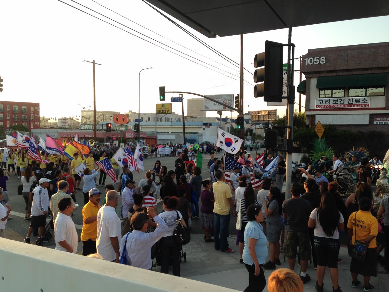 Marchers walk in solidarity on the corner of Olympic Ave and 11th Street on August 2. [Korea Daily Photo/Hankyul Sharon Lee]